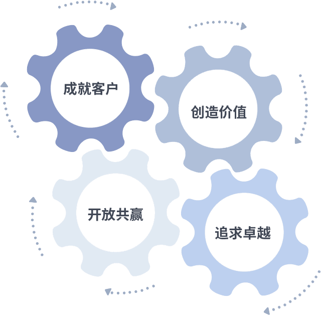 成就客户是一切决策的出发点,,,,创造价值是衡量所有工作的标准,,,,追求卓越是我们做事做人的态度,,,开放共赢是我们的格局也是最终的结果。。价值观的齿轮环环相扣,,推动着组织里的每个人不断向前。。。